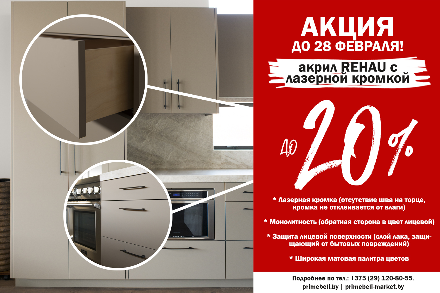 Перезвоните мнеАКЦИЯ ДО 31 МАРТА (продлена)! Скидка на кухни из акрила с использованием лазерной кромки!